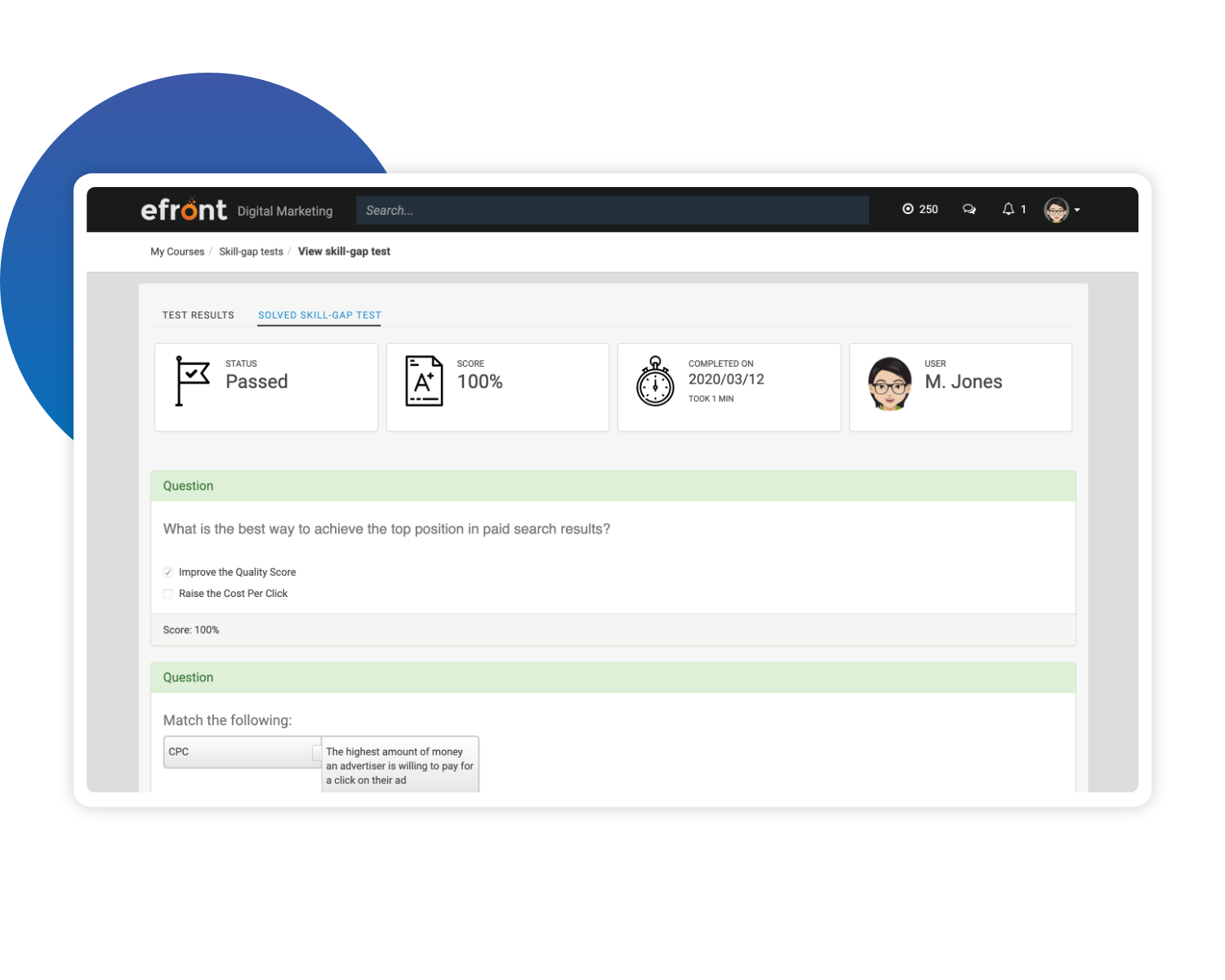 According to research, over 83 percent of organizations have skills gaps, and the number is expected to grow. Evaluate your learners’ knowledge with specially designed skills gap tests, identify missing skills, and adjust your training appropriately to meet your business goals. All without leaving or fighting the platform.